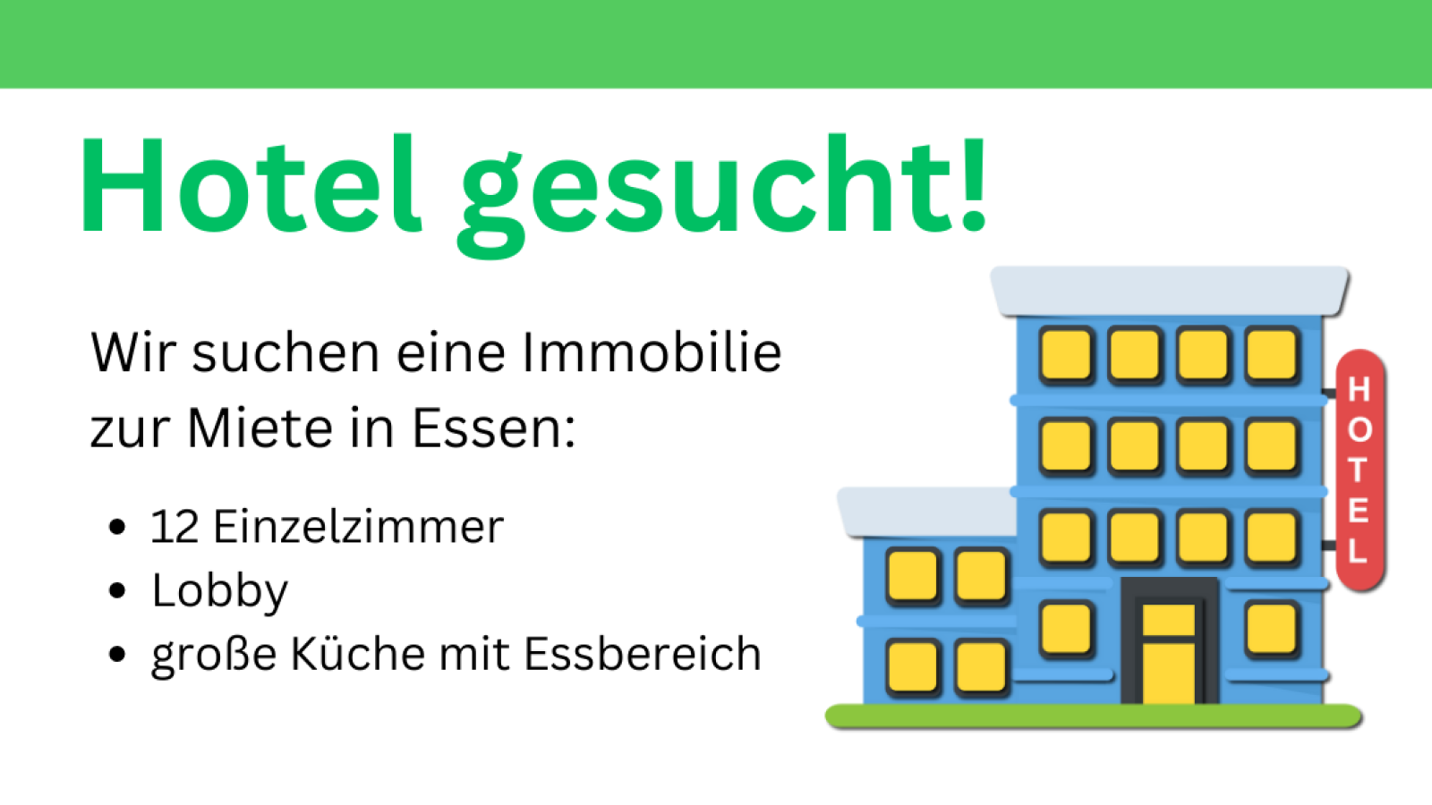 Die Immobilie sollte im Essener Stadtgebiet liegen und möglichst gut an den ÖPNV angeschlossen sein. Benötigt werden 12 Einzelzimmer oder Mini-Appartements sowie eine Lobby und eine große Küche mit Essbereich.