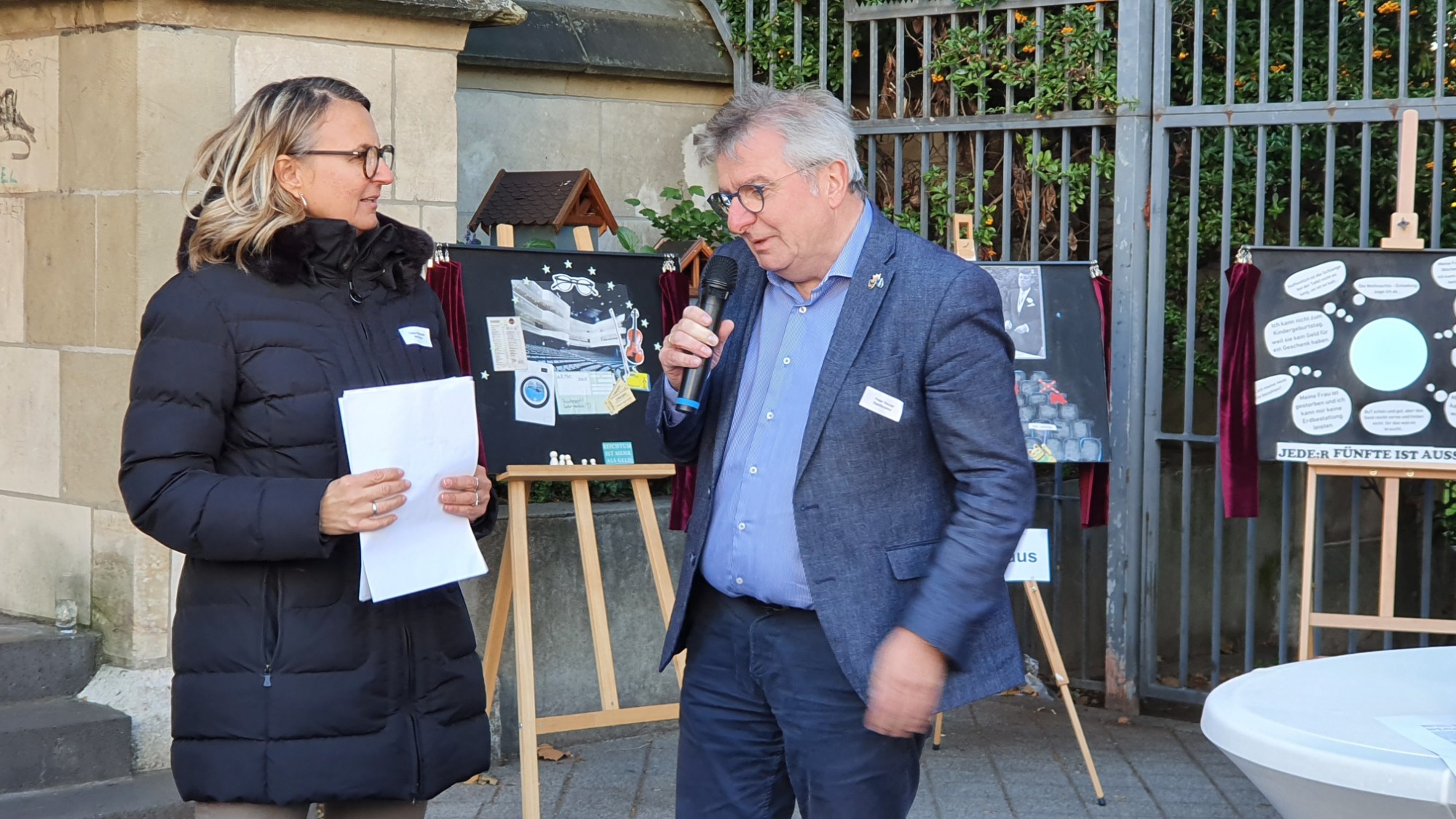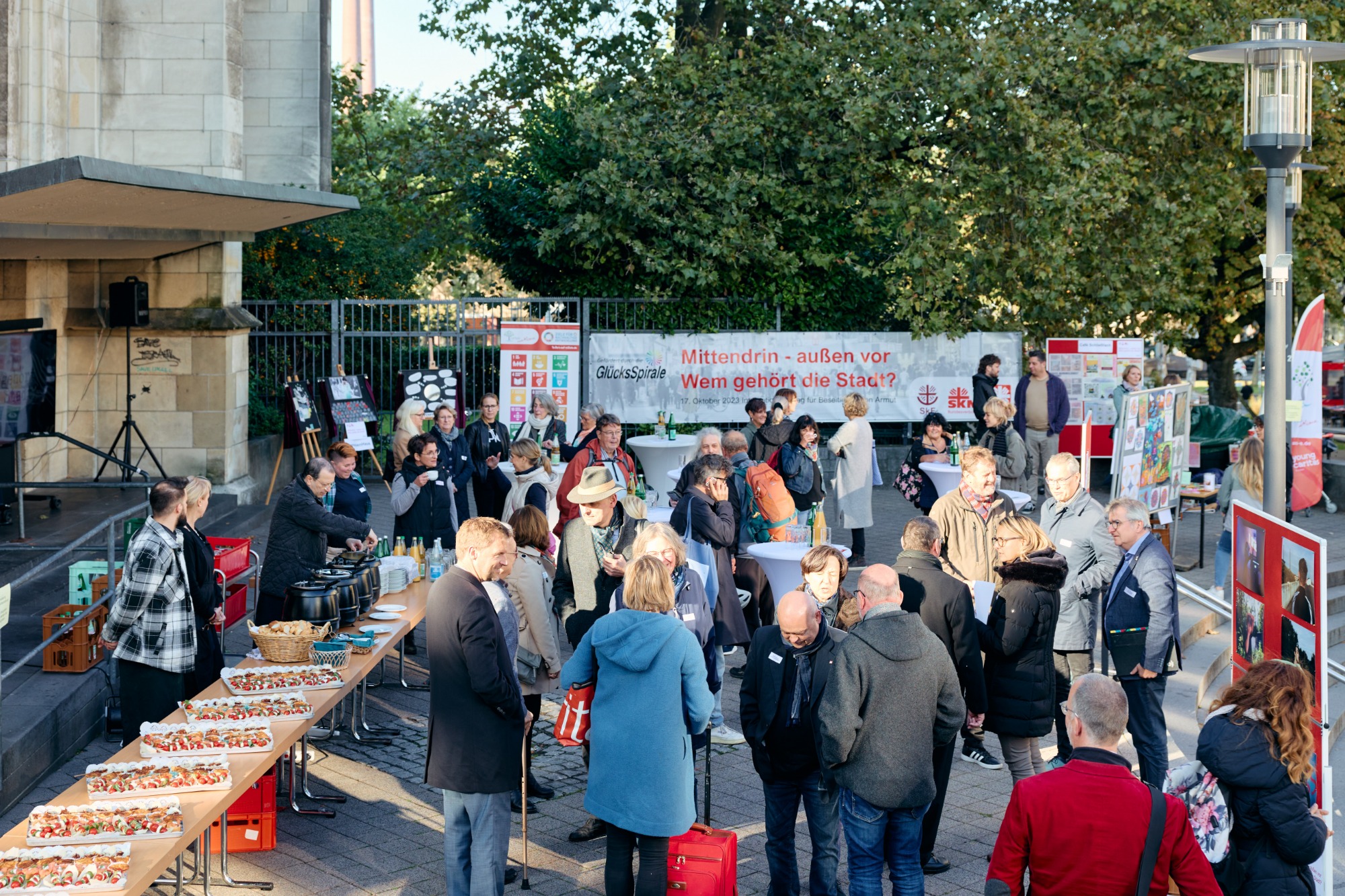 Caritas Deutschland, Sozialdienst katholischer Frauen und SKM Bundesverband hatten am 17. Oktober 2023 zu einem Tischgespräch mit Vertretern aus Politik und Kirche vor der Kirche St. Gertrud in der Essener Innenstadt eingeladen. Mitarbeiter:innen, Klient:innen und Ehrenamtliche unserer Einrichtungen zeigten die Sicht und Herausforderungen der von Armut betroffenen Menschen in Videos, Statements, Fotoprojekten oder mit einem nachgestellten Schlafplatz. Auf dem Vorplatz von St. Gertrud diskutierten Interessensvertreter:innen und Bürger:innen unter anderem mit Stadtdirektor Peter Renzel, Weihbischof Ludger Schepers, SkF und SkM Bundesvorstand sowie Caritas-Präsidentin Eva Maria Welskop-Deffaa über Stadtentwicklung, öffentliche Flächen und Liegenschaften und ökologische Neugestaltung.