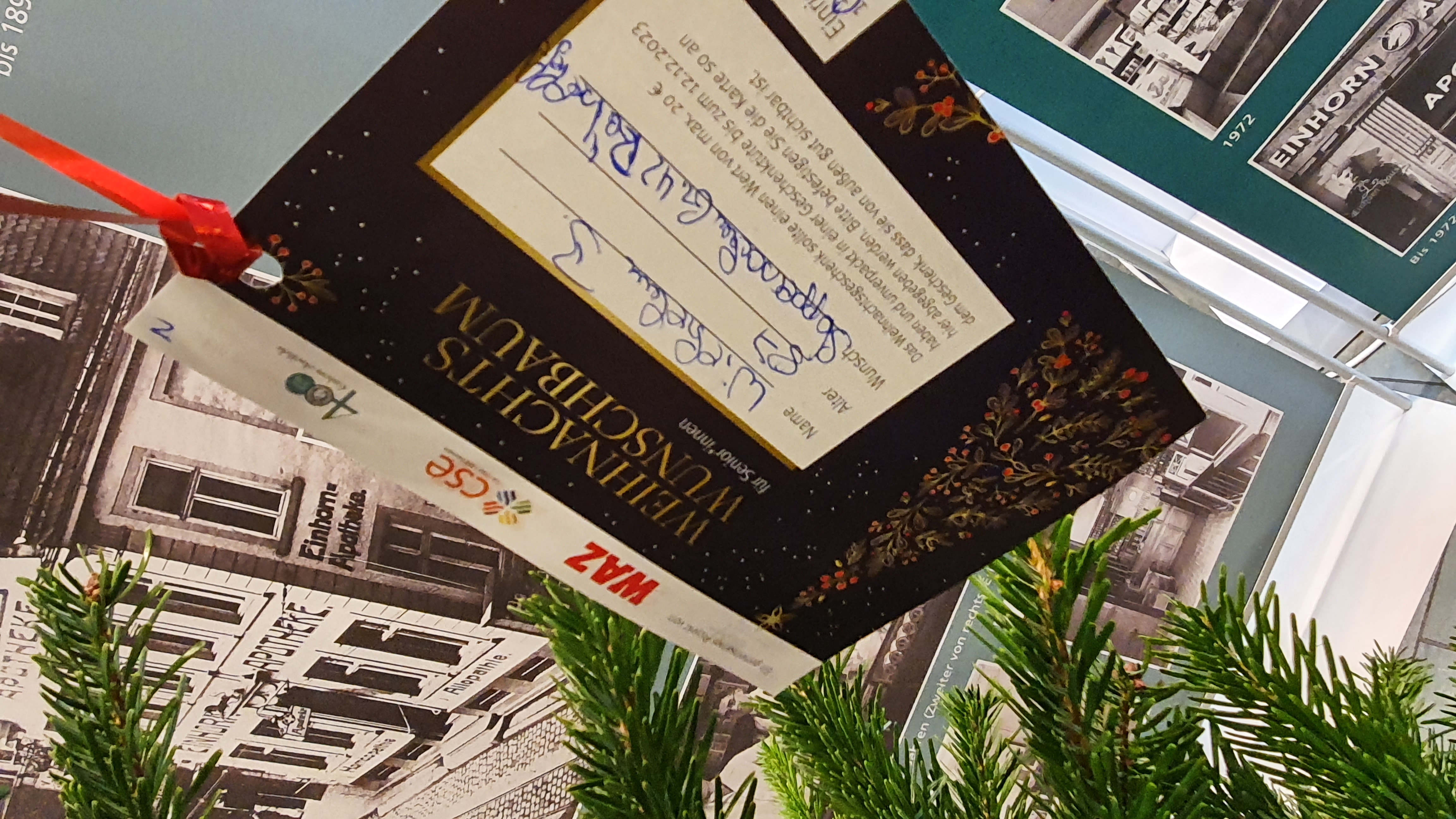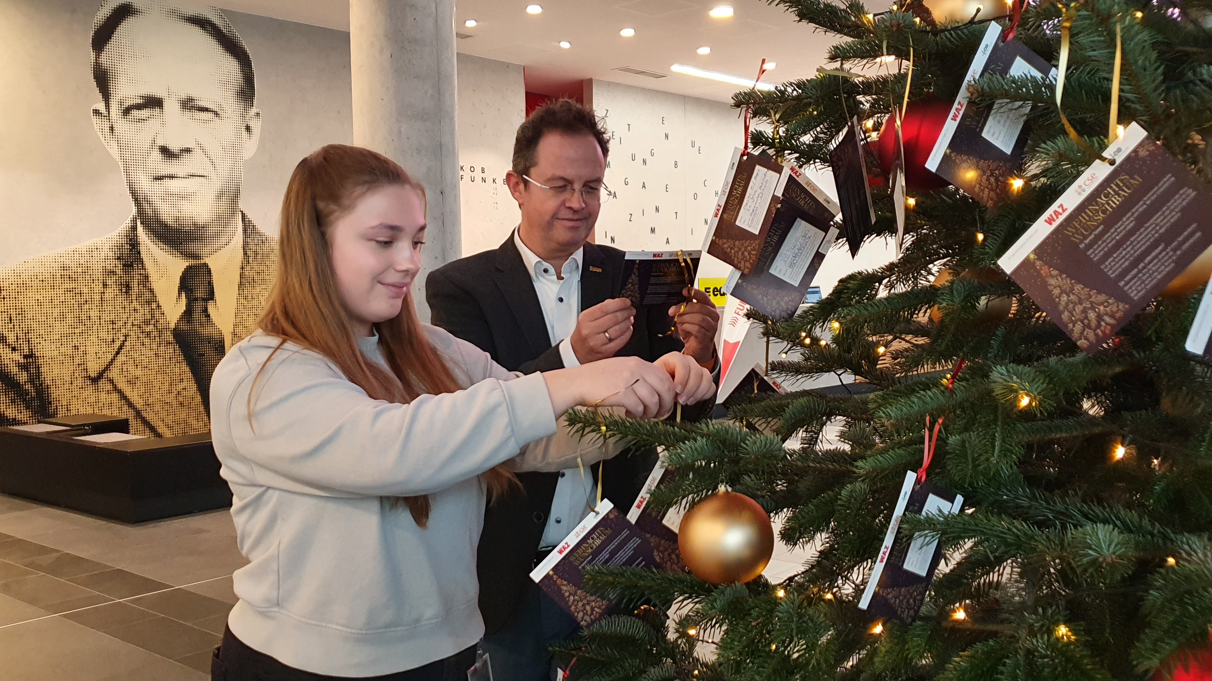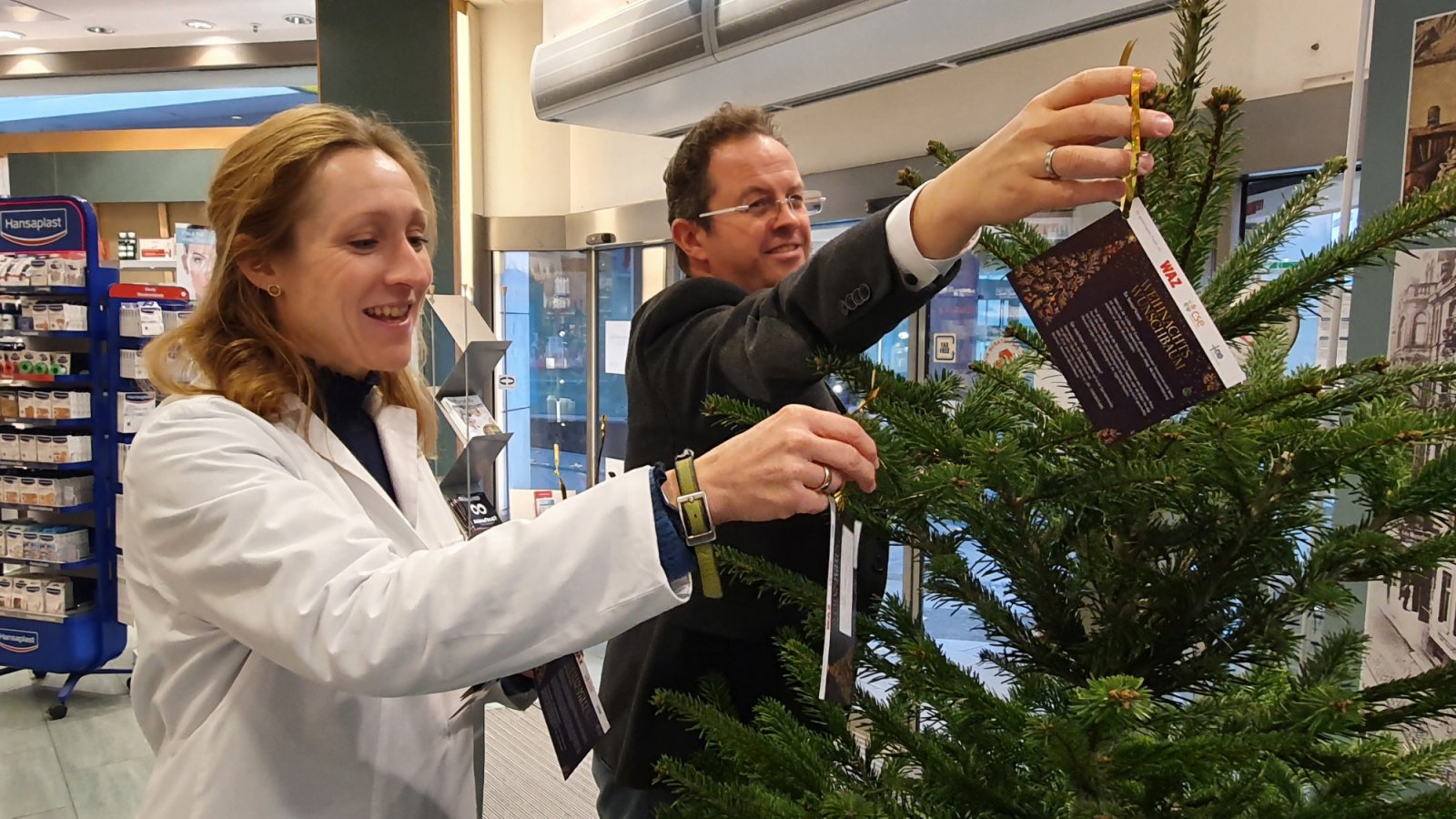 Rund 500 Wünsche, darunter ein Malbuch für Erwachsene, Duschgel oder warme Wollsocken und Decken können von unseren Wunschbäumen in der Einhorn-Apotheke und im Foyer der Funke Mediengruppe abgepflückt und diese und nächste Woche erfüllt werden! Birte Barleben, Inhaberin der Einhorn-Apotheke und Andreas Bierod, Geschäftsführer der Caritas-SkF-Essen gGmbH, bestückten den Baum in der Apotheke eigenhändig und und lasen viele der bescheidenen Wünsche, die nachdenklich stimmten. Im Foyer der Funke Mediengruppe schmückte Andreas Bierod den Baum gemeinsam mit Angelina Scholz, Auszubildende. Für sie ist die Organisation des Weihnachtswunschbaums eines der ersten Projekte.