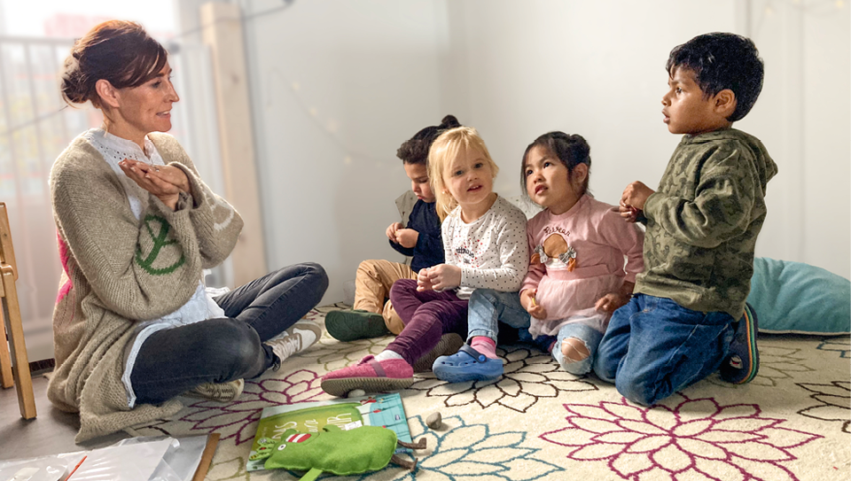 Amir, Viktoria, Viola und Prajan haben große Lust, mit Nicole Weyer im Nebenzimmer zu lesen und zu erzählen. "Darf ich das kleine ‚Wir‘ haben?", fragt Viktoria und nimmt das kleine grüne Stoffwesen glücklich in die Arme. Im "Lesezimmer" ist es so gemütlich, wie es in einem provisorischen Container sein kann. Darin ist die Kita wegen eines Neubaus derzeit untergebracht. Die Kinder kuscheln sich am Fenster auf einer kleinen Matratze zusammen, Weyer setzt sich auf den Teppich. "Sollen wir uns zuerst mal begrüßen und uns unsere Namen sagen?", schlägt die Diplom-Pädagogin vor. Viktoria ergreift sofort die Initiative. Nicht ihr, sondern dem kleinen "Wir" in ihren Händen sagen alle nacheinander "Hallo" und ihren Namen. Dann kann es losgehen. "Jetzt brauchen wir nur unser Herz, unsere Stimme und unsere Ohren", leitet Weyer die erste Seite im Buch ein. Die Kinder sind in Redelaune. Gar nicht so einfach, ein Buch zu lesen, wenn vier kleine Köpfe lauter unterschiedliche Gedanken dazu haben und diese auch äußern wollen. Ein Redestein, den der festhält, der gerade spricht, lässt jedem die gebotene Aufmerksamkeit zukommen - zumindest in der Theorie. Zum Abschluss dürfen sich alle Kinder noch einen Buchstaben aus der Buchstabenkiste nehmen.
