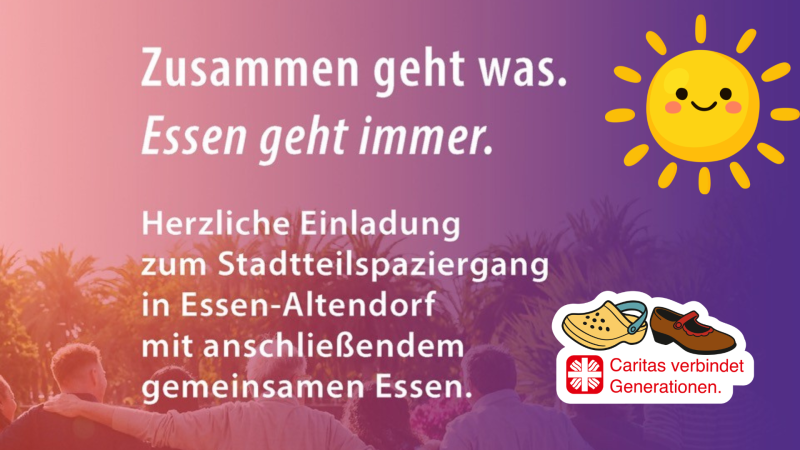 Herzliche Einladung!Unter dem Motto der Caritas-Jahreskampagne „Zusammen geht was. Caritas verbindet Generationen“ laden die Referate des Caritasverbandes für die Stadt Essen e.V. gemeinsam mit der Gemeinde St. Mariä Himmelfahrt sowie weiteren Akteuren aus dem Stadtteil zu einem generationenübergreifenden Stadtteilspaziergang durch Essen-Altendorf ein.